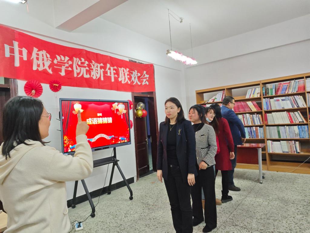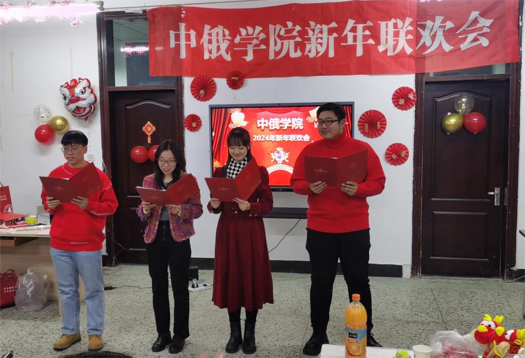 凝心聚力共奋斗,砥砺奋进再起航。12月29日,中俄学院在学院223室举办了“筚路蓝缕结硕果 勠力同心再出发”2024年新年联欢会。中俄学院党总支书记张丽丹,院长贾旭杰,副院长、工会主席唐伟,党总支副书记周波,副院长徐美玲及全体教工欢聚一堂,共辞旧岁,喜迎新年。联欢会由李宏磊、林令浛、宋佳、于佳丽主持。